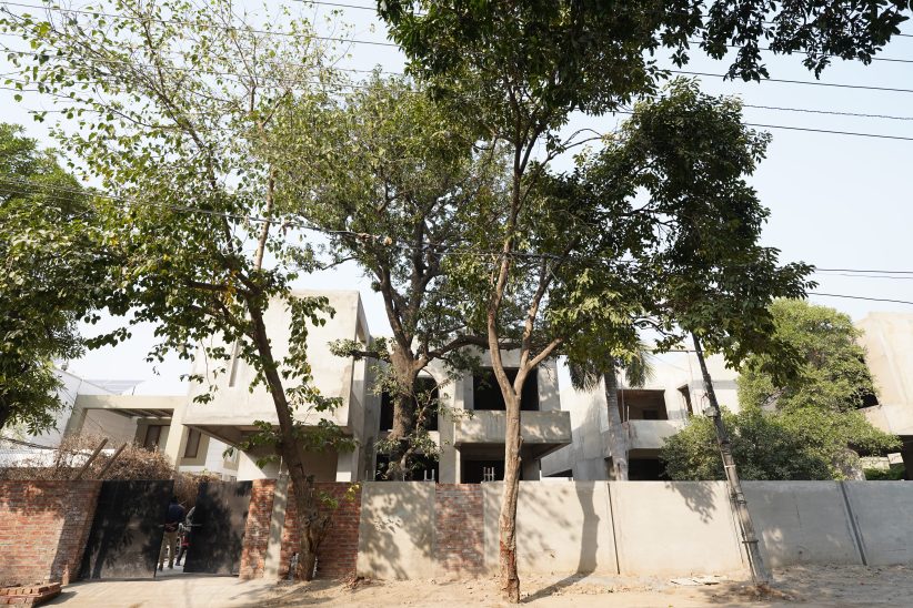 Excavation, foundations, RCC structure (columns, beams, slabs), and superstructure for both homes.